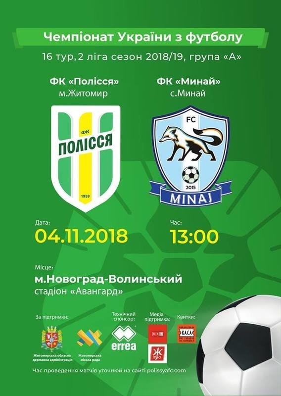 В рамках чемпіонату України з футболу серед команд ІІ ліги «А» сезону 2018/2019, 4 листопада 2018 року о 13:00 годині між командами: ФК «Полісся» (м. Житомир) - ФК «Минай» (с. Минай) на території міського стадіону «Авангард» (вул. Івана Мамайчука, 13) відбудеться футбольний матч