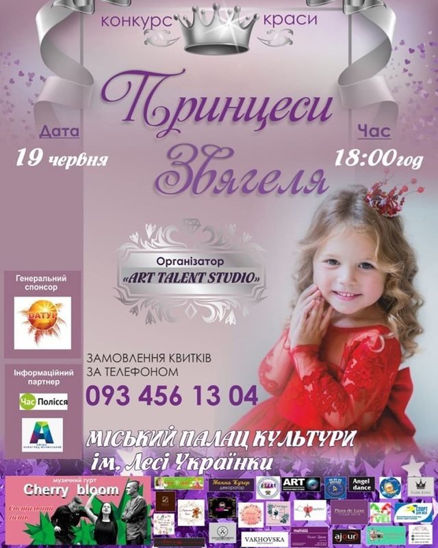 Конкурс краси "Принцеси Звягеля" відбудеться 19 Червня о 18.00 у Новоград-Волинському Міському Палаці Культури ім. Лесі Українки. Організатори конкурсу Art talent studio - Студія талантів.