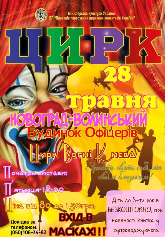 Не пропустіть нову розважальну програму для усієї родини! Неймовірні трюки, захоплюючі номери найкращих артистів України, жонглери, акробати, гімнасти, фокусники, еквелібристи, канатоходці, смертельний політ під куполом цирку , найвеселіші клоуни та багато-багато іншого у новому шоу Київського Державного цирку-шапіто "Вогні Києва" у Будинку офіцерів з 28 травня о 18 годині.