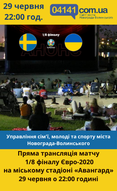 Запрошуємо усіх бажаючих мешканців Новограда-Волинського на пряму трансляцію матчу 1/8 фіналу Євро-2020 на міському стадіоні «Авангард».