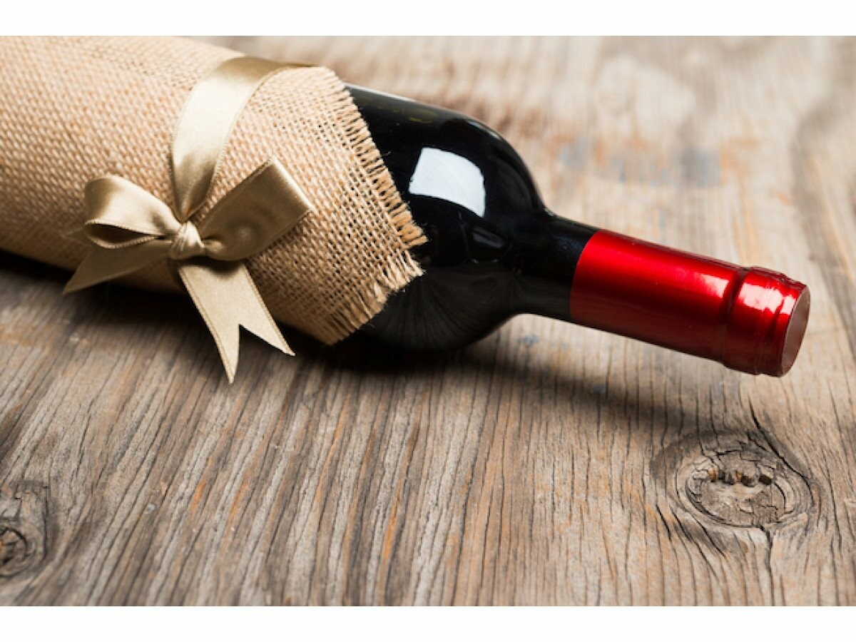 Бутылку можно положить в плетеную корзину и добавить набор бокалов или специальные камни для охлаждения алкоголя.