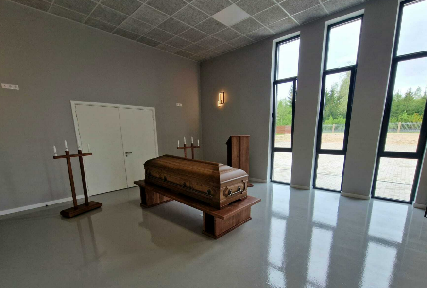 - В ритуальном зале местного похоронного бюро, с которым сотрудничает оператор по перевозке.