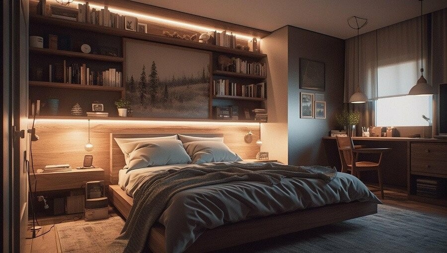 Кожна зона в кімнаті має свої потреби в освітленні. Робоче місце потребує яскравішого світла, зона відпочинку — м’якшого та теплого. Настільні лампи, бра, торшери або підсвітка полиць допомагають виділити окремі функціональні зони та зробити простір більш зручним.