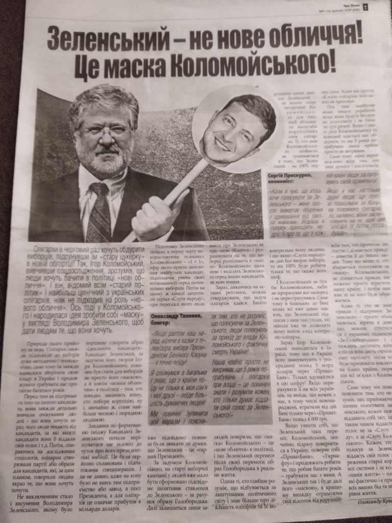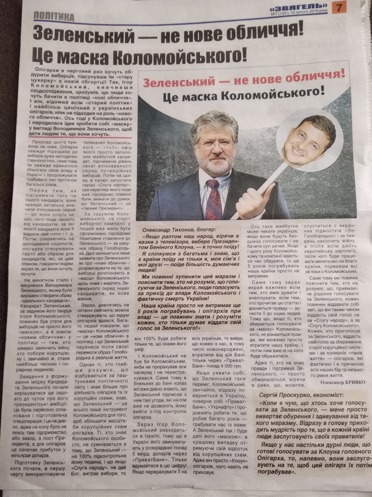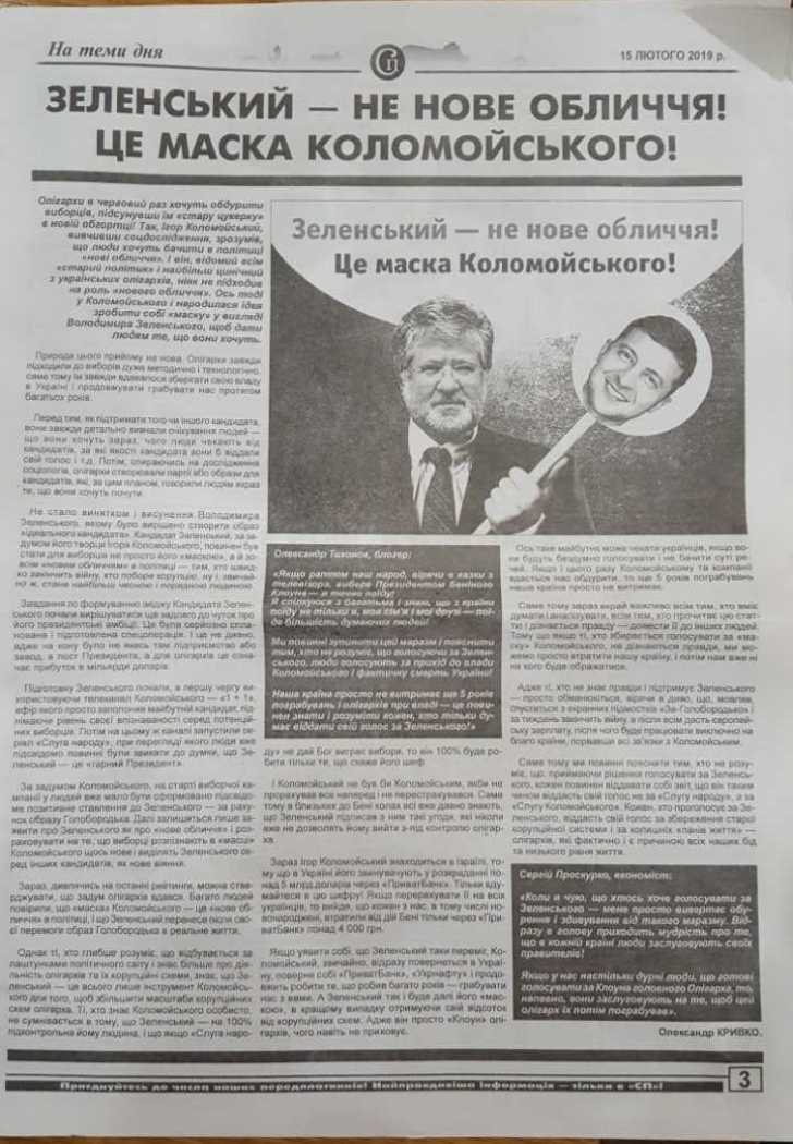 Ідентичні матеріали в цих чотирьох виданнях розміщені з однаковим заголовком «Зеленський – не нове обличчя! Це маска Коломойського!». Автор – Олександр Кривко.