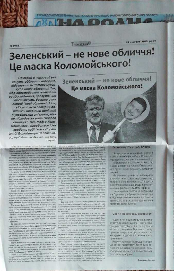 У газеті Ємільчинського району «Народна Трибуна» матеріал з таким змістом вийшов 15 лютого на 6 сторінці. У цьому ж номері на 7 сторінці ще один матеріал під назвою «Коломойський іде у Президенти».