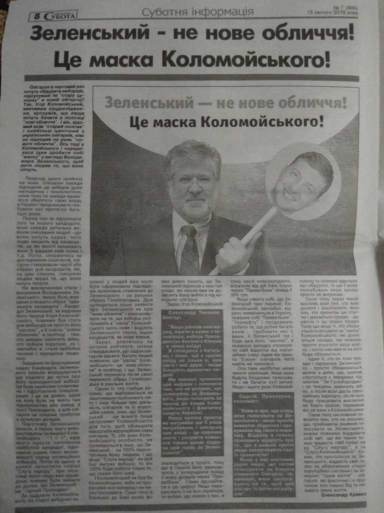 У друкованих виданнях Житомирської області «Час плюс», «Звягель», «Народна трибуна», «Соборна площа» та «Субота» розміщені матеріали з ознаками «чорного піару» проти кандидата в Президенти Володимира Зеленського. Дати виходу газет – 13-14-15 лютого.