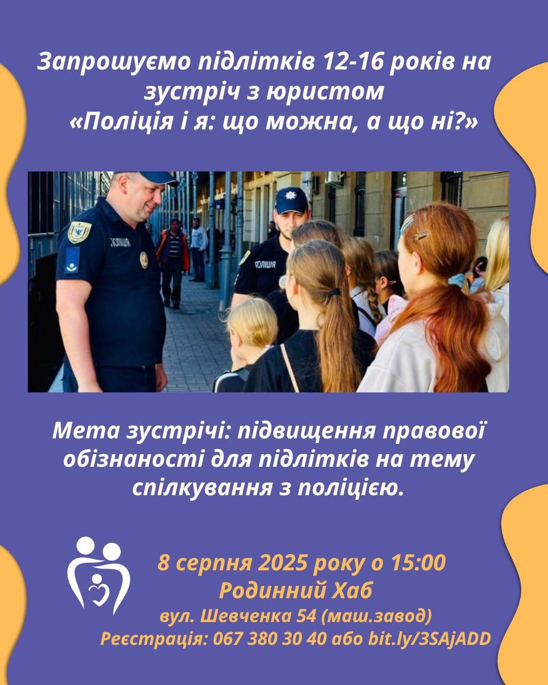 Це буде зустріч з юристом. Підлітки дізнаються про свої права, правила спілкування з представниками поліції й корисні юридичні поради для повсякденного життя.