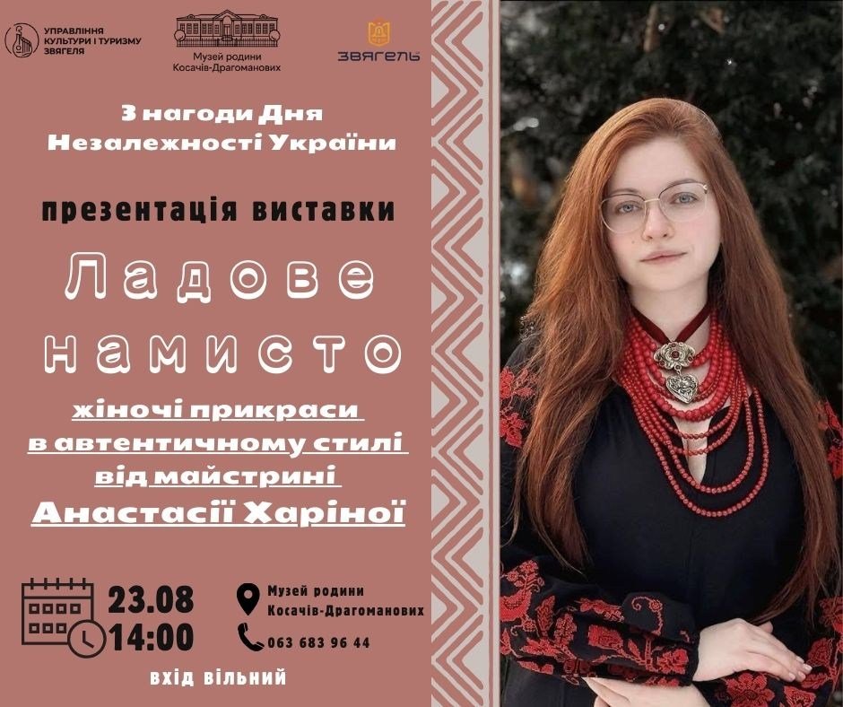 У Звягелі з нагоди Дня Незалежності України відбудеться виставка автентичних жіночих прикрас «Ладове намисто» майстрині Анастасії Харіної. Музей родини Косачів-Драгоманових про це інформує у фейсбуці.