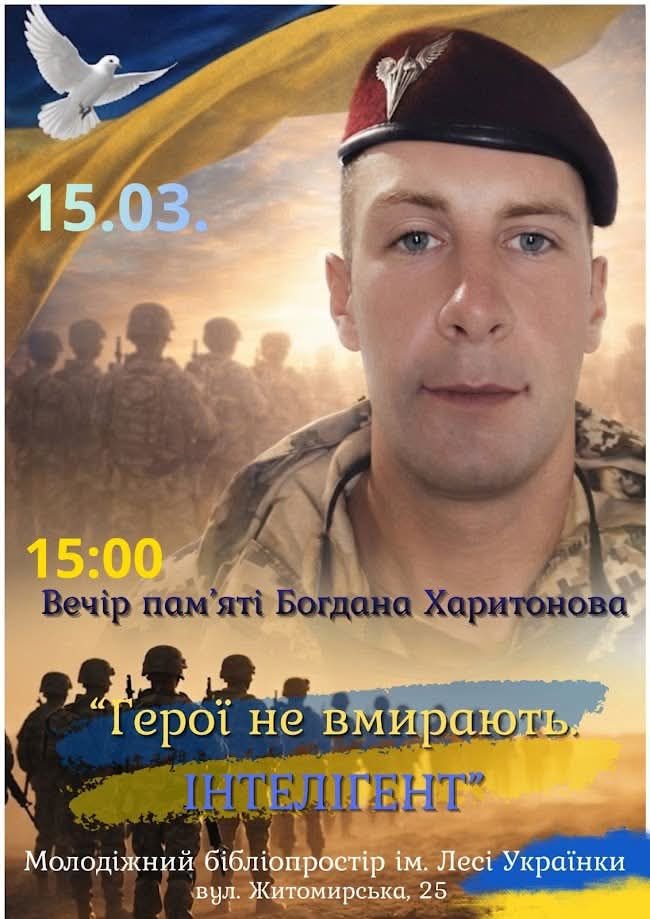У неділю, 15 березня, у звягельському Молодіжному бібліопросторі ім. Лесі Українки відбудеться вечір пам’яті загиблого захисника Богдана Харитонова. Про це інформує Звягельська бібліотека.