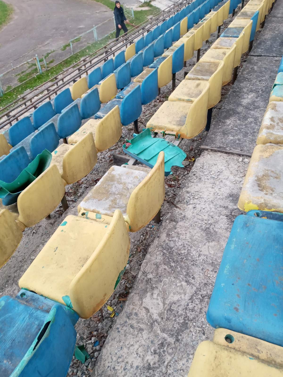 Так, на стадіоні поламали стільці на арені, знищили біотуалет, вирвали стовпчики огорожі та навіть повіддирали літери з вивіски при вході.