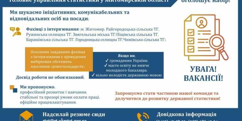 Головне управління статистики у Житомирській області цьогоріч відновлює проведення вибіркових обстежень домогосподарств (населення). Тож оголосило набір фахівців з інтерв’ювання у Звягельській громаді, а також у районі. Шукають комунікабельних, ініціативних та відповідальних осіб. Про це йдеться у повідомленні пресслужби Звягельської міської ради із посиланням на Головне управління статистики у Житомирській області. За інформацією Держстату, метою такого...