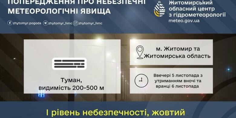 Житомирщину та обласний центр накриє туман: очікується він вже сьогоднішнього вечора, а також утримається уночі та вранці 6 листопада. Видимість 200-500 (І рівень небезпечності, жовтий). Про це попереджає Житомирський обласний центр з гідрометеорології. У зв'язку з цим рятувальники закликають бути обачними на дорозі: – Водії, будьте уважні за кермом, дотримуйтеся дистанції та швидкісного режиму! Пішоходи, переходьте дорогу лише у визначених місцях і перек...